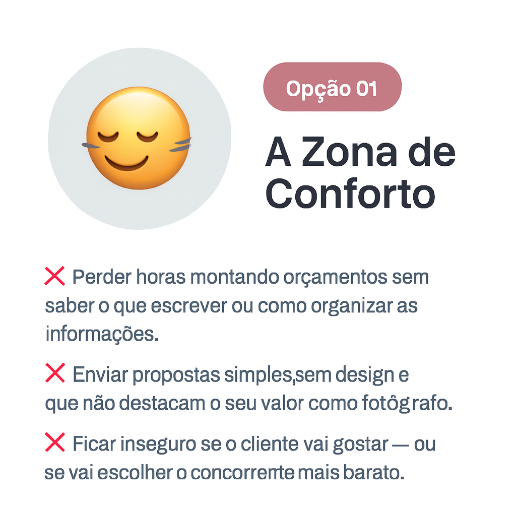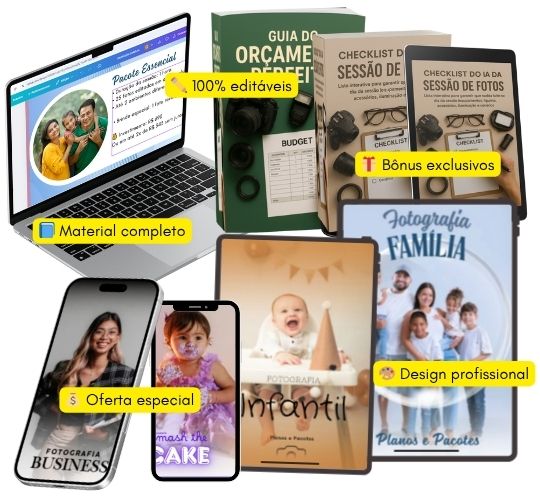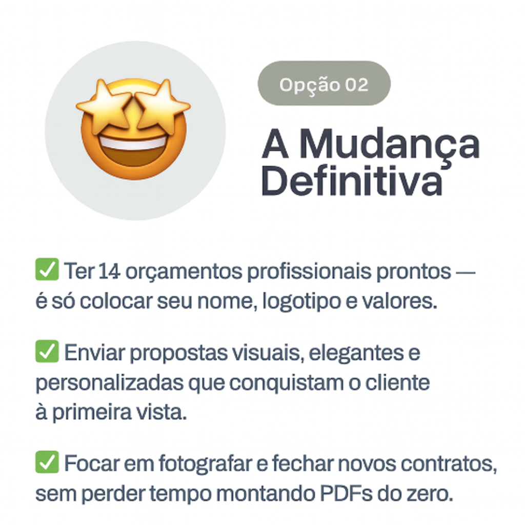 “O Pack de Orçamentos Fotográficos foi desenvolvido para que você só adicione seu nome, a sua história, preços, e pronto. Em minutos, você terá um orçamento visual, claro e profissional que impressionará o cliente e o fará dizer ‘sim’ mais rápido.”